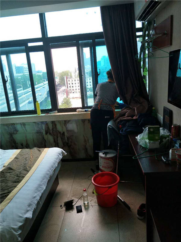 3、 擦玻璃:先用毛巾把玻璃框擦拭干净,再用涂水器沾稀释后的玻璃水溶液,均匀的从上到下涂抹玻璃,有顽固的污渍用铲刀清除干净,再重复以上工序后用刮子从上到下刮干净,用干毛巾擦净玻璃及框上留下的水痕。